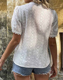 Elegância e Charme: Blusa Feminina de Renda com Ilhós Decote em V e Manga Curta