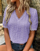 Adquira já a sua Blusa Feminina de Renda com Ilhós, Decote em V e Manga Curta e adicione um toque de charme e elegância ao seu guarda-roupa!